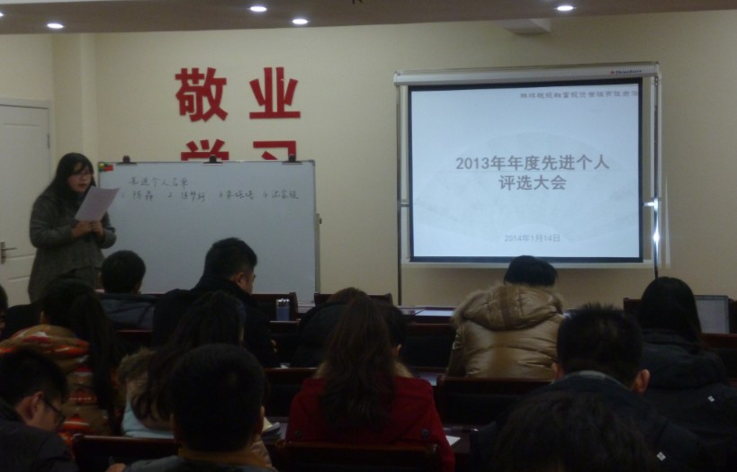 2014年1月14日,蚌埠皖投融富投資管理有限責任公司先進個人評選活動在項目營銷中心會議室舉行?;顒佑煽偨浝碇x東至主持,蚌埠皖投融富全體員工參加。此次先進評選采取匿名投票的方式進行,現(xiàn)場投票、唱票、統(tǒng)計,本著公平、公正、公開的原則評選出了蚌埠皖投融富2013年度“先進個人”。